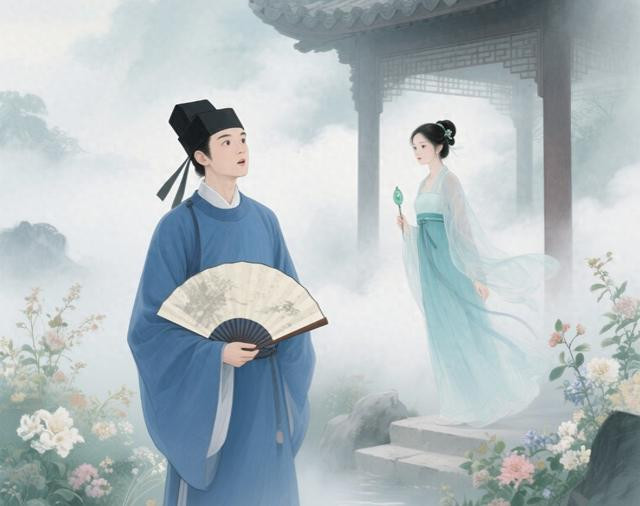 李生这才回过神来,慌忙作揖:"小生李生,冒昧闯入宝地,还望仙子恕罪。"